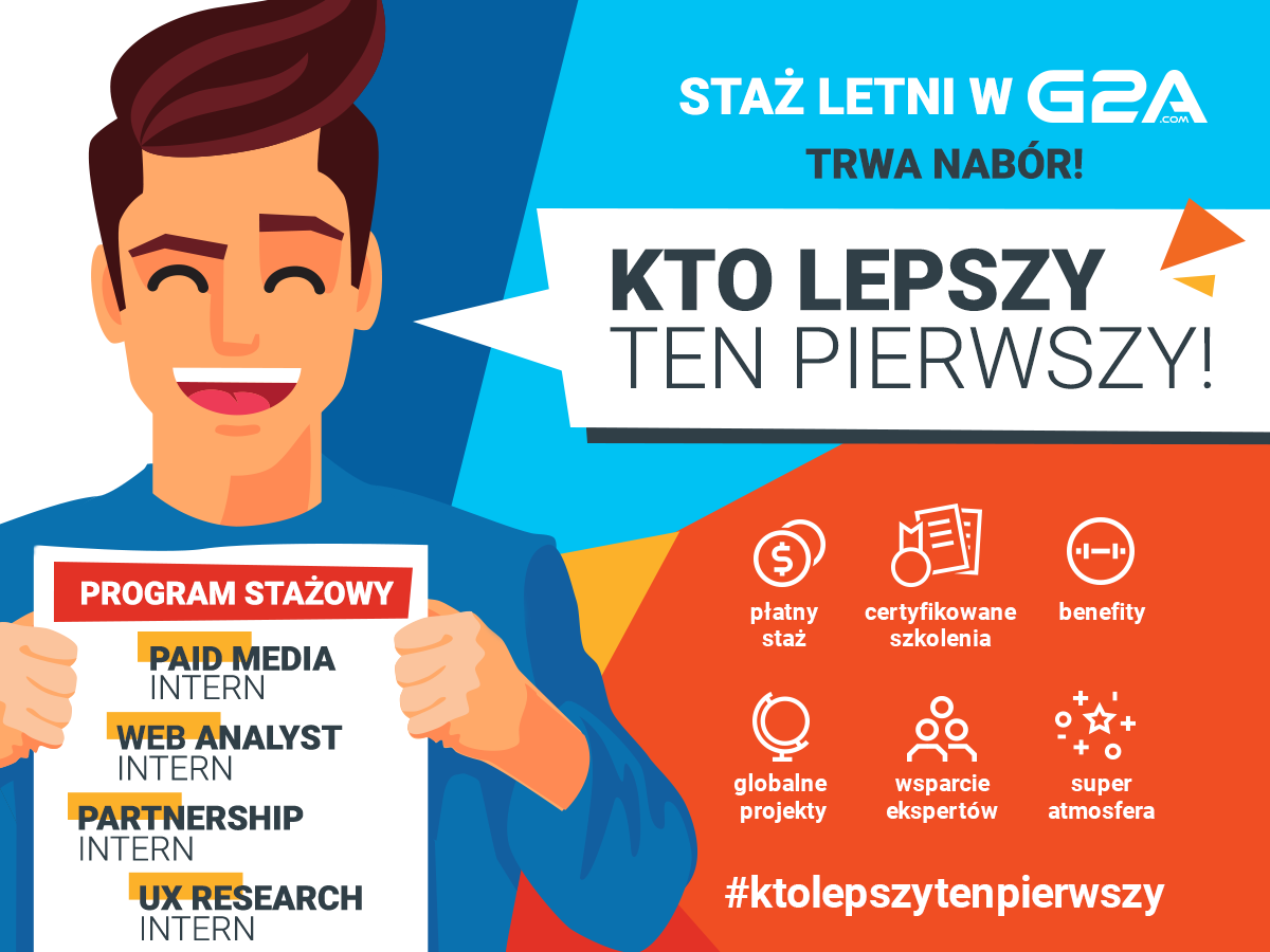 Firma G2A.COM rozpoczęła rekrutację na letni staż dla studentów i absolwentów pod nazwą Next Level. Przygotowano 6 miejsc stażowych na poszczególnych stanowiskach do zespołów: Partnerships, Web Analytics, Paid Media oraz UX Research.