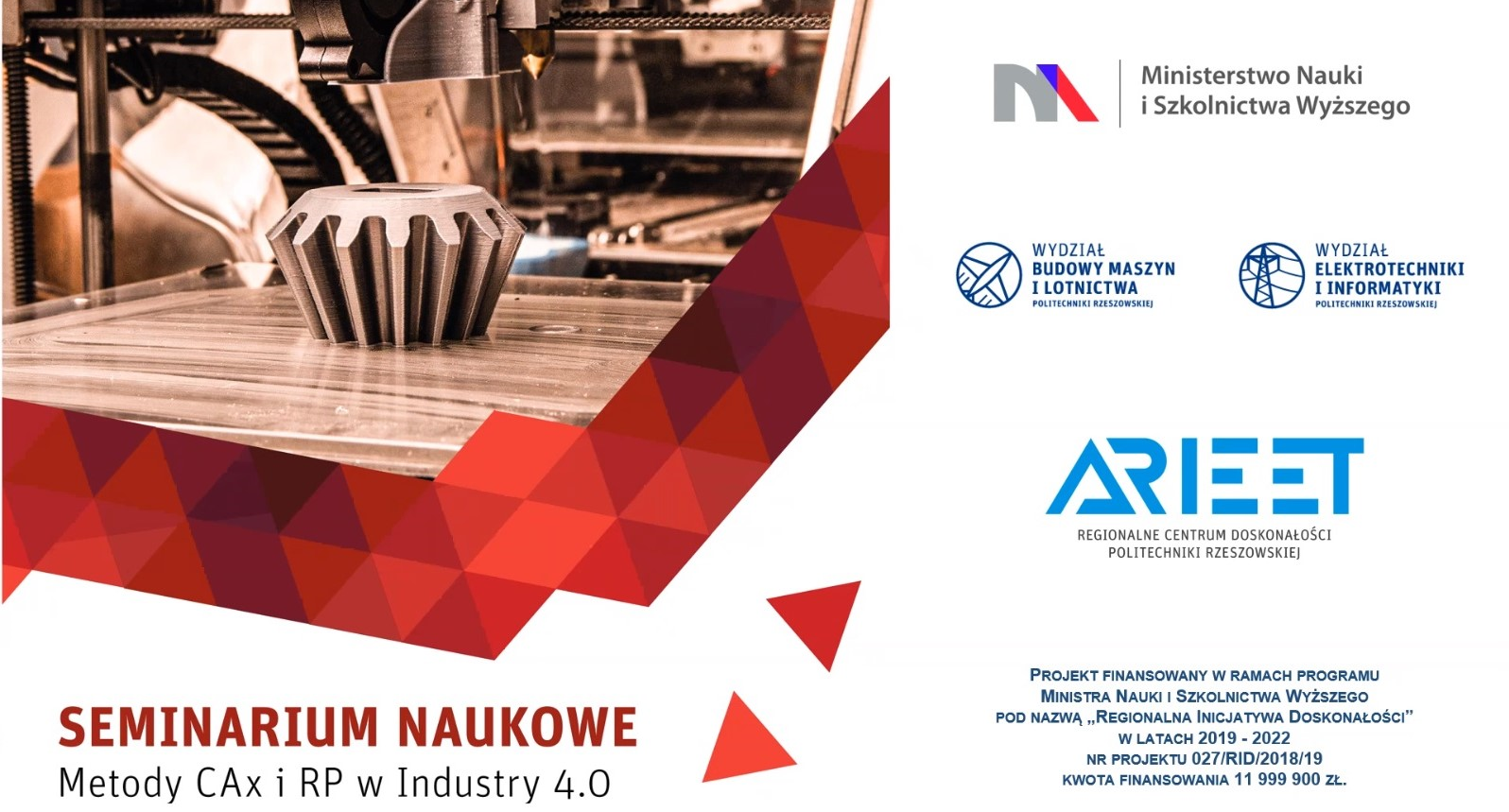 Seminarium „Metody CAx i RP w Industry 4.0” stanowi jedno z działań podejmowanych w ramach realizacji projektu pn. „Regionalne Centrum Doskonałości Automatyki i Robotyki, Informatyki, Elektrotechniki, Elektroniki oraz Telekomunikacji Politechniki Rzeszowskiej”, który jest współfinansowany ze środków Ministerstwa Nauki i Szkolnictwa Wyższego w ramach programu „Regionalna Inicjatywa Doskonałości”. Celem tych działań jest wzrost potencjału naukowego Politechniki Rzeszowskiej oraz wymiana wiedzy i doświadczenia pomiędzy środowiskiem akademickim a otoczeniem społeczno-gospodarczym.